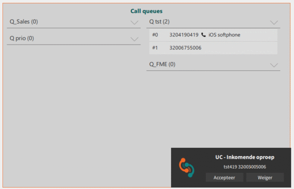Er is ook te zien welke Queue Agent een oproep heeft aangenomen.